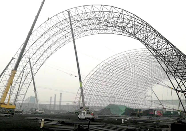 球形網架施工方案  1、工程概況和總體部署  網架采用正放四角錐形式,采用螺栓球接點,采用普通鋼管材,采用兩側焊接水平支座。  網架采用聚碳酸酯屋面,采用小立柱找坡的單向內排水方式,天溝鋼板厚度6mm。  2...